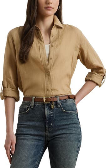 Lightweight linen lends a breezy feel to this timeless button-up shirt featuring a warm neutral hue and roll-tab cuffs to adjust the sleeves.