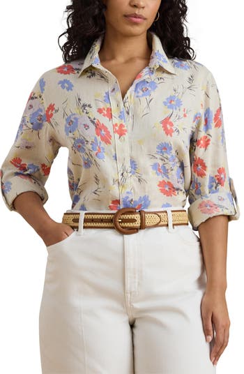 A pretty floral print covers a relaxed-fit shirt made from pure, breathable linen and finished with roll-tab cuffs to underscore the easygoing look.