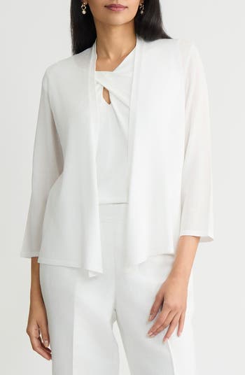An open-front silhouette and three-quarter-length sleeves give this lightweight cardigan an easy drape that layers effortlessly over polished separates.