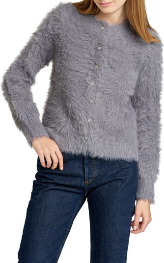 Be ready for snuggle season in a fabulously fuzzy cardigan knit with sparkly heart buttons running up the front.