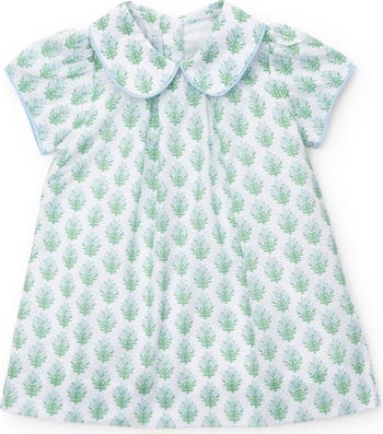 Woven pima cotton short sleeve dress with more formal structure. Peter pan collar and contrasting piping detail. Made from 100% Peruvian cotton. Our woven pima cotton has a light, clean feel; still super soft with a more polished look for special occasions!