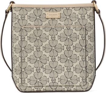 Signature spades stand out against the coated canvas exterior of a slim crossbody bag designed with multifunctional pockets and suspended from an adjustable strap.