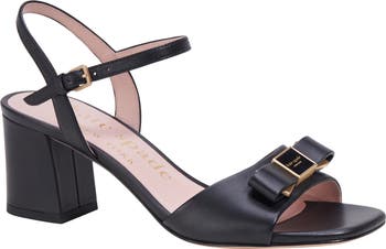 A prim branded bow puts a polished finish on the patent-leather toe strap of this quarter-strap sandal set on a walkable block heel.