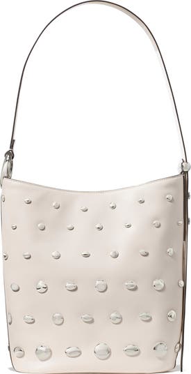 Mixed studs punctuate the grained leather exterior of a spacious bucket bag designed with a slightly slouchy topline and suspended from an adjustable shoulder strap.