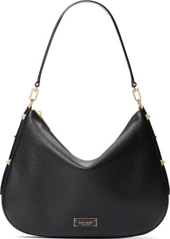 A signature logo plaque highlights the richly pebbled leather exterior of a hobo bag designed in a streamlined silhouette and suspended from an removable shoulder strap.