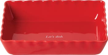 This stoneware baking dish adds a bit of kate spade charm to your kitchen with a bold red hue and 'let's dish' printed on the inside.