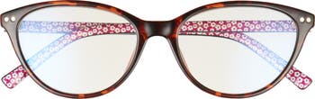 Cat-eye frames lined with flowers refresh the look of these sophisticated reading glasses that also help filter out blue light from screens and devices.
