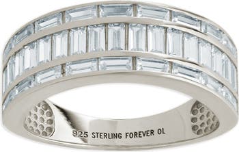 This three-row ring makes a bold statement with shimmering baguette-cut cubic zirconia set in clean, stacked rows. Designed for maximum sparkle, it delivers a sleek, light-catching look with high-wattage impact.