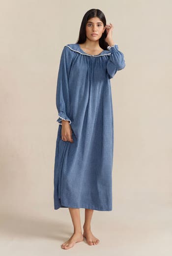 Soft and comforting in brushed cotton twill, Katharine is a long nightie in a charming denim check. Designed with a ruffle collar and keyhole neckline, she features full-length sleeves with gentle elasticated cuffs. Timeless, cozy and made for slow, quiet evenings.