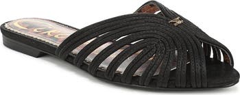 A slide sandal takes a sophisticated turn with a strappy design and perfectly polished logo hardware.
