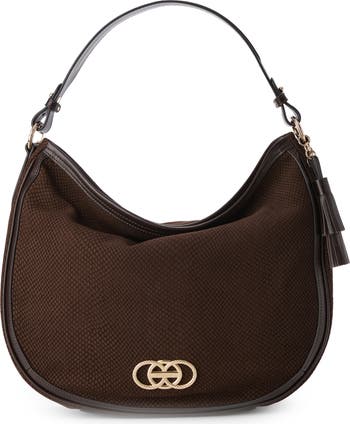 Smooth and snakeskin-embossed nubuck leather create textural interplay on a roomy shoulder bag suspended from a wide, padded strap for comfortable wear.