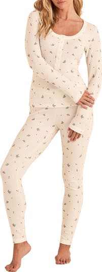 This extra-cozy waffle knit sleepwear set features a festive holiday print, a henley neckline, snap buttons, and long sleeves, along with matching leggings. This PJ set is perfect for staying in all season long.