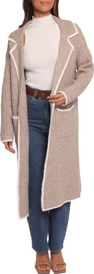 Contrasting trim frames a cozy sweater-coat knit from soft, wool-enriched yarns and finished with handy patch pockets.