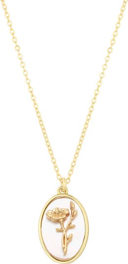 Celebrate your birth month with the soft elegance of this gold and pearl necklace, featuring a mother-of-pearl oval pendant with a delicately raised flower motif.