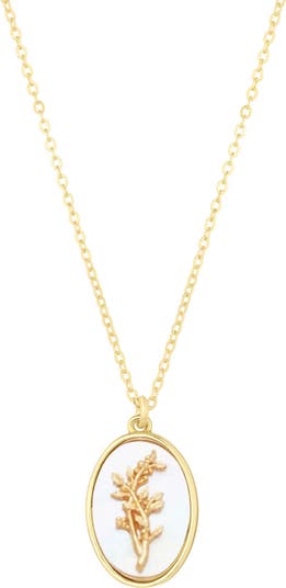Celebrate your birth month with the soft elegance of this gold and pearl necklace, featuring a mother-of-pearl oval pendant with a delicately raised flower motif.