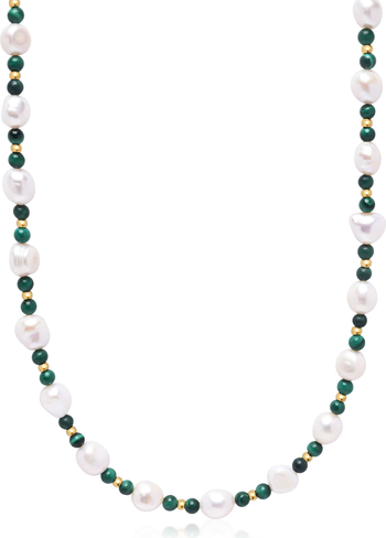 7mm cultured baroque white freshwater pearls are paired with 4mm green malachite beads in a design inspired by vintage summers on the Italian coast. Each piece is handmade and unique, reflecting natural variations in size, shape, and color. Pearls are 100% natural and may show slight imperfections that highlight their authenticity. Lock is crafted from stainless steel with gold plating.
