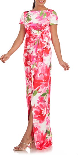 Stand out at your next special occasion wearing this stunning column gown styled with a bold floral pattern and a gathered twist at the side.