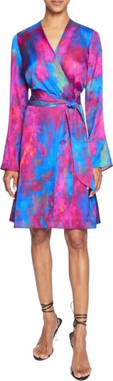 - Long Sleeve Faux Wrap Fit and Flare Dress in Abstract Printed Charmeuse