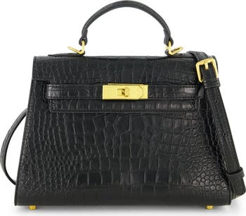 The Kayla Croco Handbag features a refined flap top with a gold-tone turn lock closure and a structured top handle, offering an elegant designer look. Its croco-effect exterior adds timeless sophistication, while the removable shoulder strap lets you wear it multiple ways for versatile style. Perfect for elevating any outfit with a touch of classic luxury.