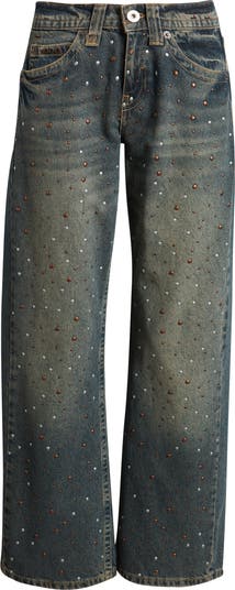 Travel back in time to the 2000s in baggy, full-length low-rise jeans made from nonstretch denim and studded to perfection.