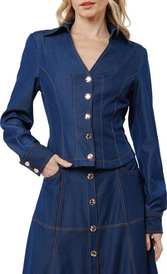 A sleek twist on denim, this tailored shirt delivers effortless sophistication with its structured silhouette, contrast seaming and polished button details.