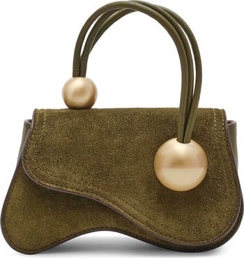 Polished leather and golden-orb hardware refine the curved silhouette of this micro-sized party-ready bag that can be slung from the crossbody strap or carried in hand.