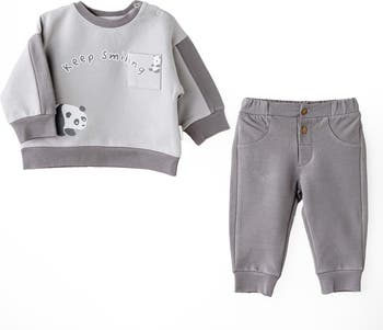 A cheerful two-piece outfit that blends cozy comfort with playful charm—perfect for little ones on the move. Light gray sweatshirt with panda graphics and “Keep Smiling” message. Functional chest pocket and shoulder snaps for easy dressing. Soft elastic-waist pants with button detail and cuffed ankles for a snug fit.