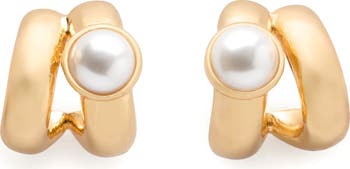 Bring a luminous glow to your lobes with these double-hoop earrings enlivened by glossy faux pearls.