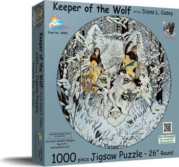 Enter the mesmerizing wilderness with SunsOut's Keeper of the Wolf 1000 Piece Jigsaw Puzzle. Capturing the enigmatic beauty of wolves and snowy forests, artist Diana Casey's exquisite round puzzle doubles as a stunning tabletop art piece and offers a calming, immersive experience. SunsOut puzzles are renowned for their craftsmanship and quality, with each piece crafted from high-quality recycled cardboard. They interlock perfectly, ensuring a satisfying, frustration-free assembly. Additionally, SunsOut upholds its commitment to sustainability and supports local manufacturing by using eco-friendly materials, like recycled boards and soy-based inks, and producing its puzzles in America. Should you encounter any issues with missing or damaged pieces, SunsOut’s excellent customer service will solve the problem, reflecting their commitment to your satisfaction. As you assemble the puzzle, you'll be captivated by the intricate details and harmonious composition of Casey's artwork, making the puzzling experience even more rewarding. SunsOut Puzzles, a proud woman-owned small business, invites you to join its legacy of creating captivating puzzles that provide hours of enjoyment while sparking your imagination. They offer the enchanting journey of exploring a winter wonderland, right from your home—one piece at a time.
