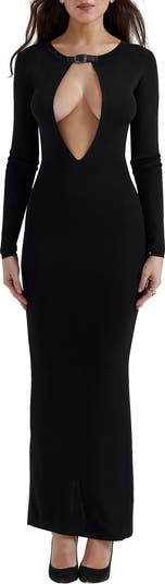 A daring chest cutout bares a tantalizing peek of skin in a figure-hugging cocktail dress fastened with a buckled belt at the neckline.