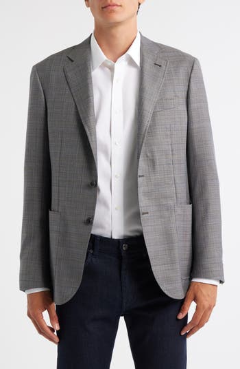 Premium Italian wool designed in an abstract plaid of golds and browns distinguishes a sport coat that's tailored in a trim fit and fitted in the waist for a smartly refined silhouette. Styled with traditional notched lapels, it brings an elegant finish to any semiformal look.