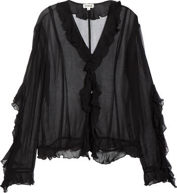Rippling ruffles animate a gossamer top that's an elegant add-in to fun and fancy looks alike.