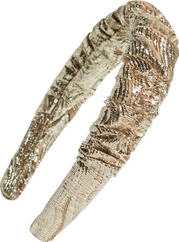 This chunky headband boasts dense gathers of a shimmering metallic fabric for lots of texture.
