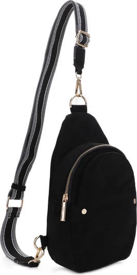Faux suede and curved lines create a softly structured sling perfect for keeping essentials close on the go.