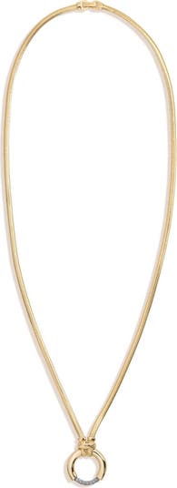 A crystal-pavé arc interrupts the hand-polished gleaming-golden ring pendant hitched to a herringbone chain on this simple yet statement-making necklace.