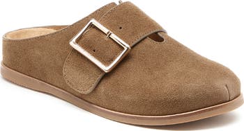 An adjustable instep strap offers comfortable wear and modern intrigue on a supple suede mule grounded by a contoured footbed and durable rubber sole.