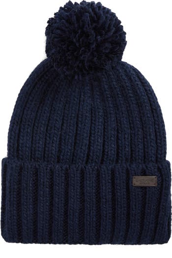 A turnback hem and yarn pompom add classic charm to this chunky-knit beanie.