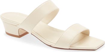 Dual top straps secure this supple leather sandal fronted by a trend-right square toe and lofted by a walkable heel.