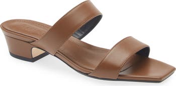 Dual top straps secure this supple leather sandal fronted by a trend-right square toe and lofted by a walkable heel.