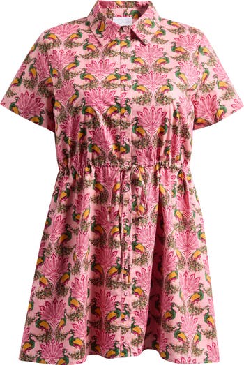 A vibrant peacock print lends striking character to this shift minidress finished with a drawstring waist that defines the silhouette.