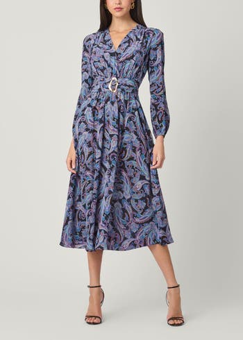 Chic dress made in printed crepe de chine fabric. This style features an overlapped V-neckline accentuated by an elegant gold abstract buckle. The front waist is ruched, and the back waist has smocking for a better fit. The three quarter length balloon sleeves have an elastic casing at the opening
