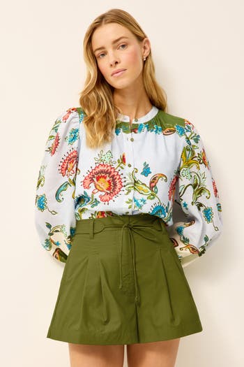 With slightly puffed sleeves and a clean button-front silhouette| the new Kendra blouse makes a subtle statement while delivering instant polish. Its even hem and hip-skimming length allow it to be worn tucked or untucked with ease. We love it styled with Lander shorts or our favorite jeans for a look that feels refined and versatile for everyday wear. Gathered detail at neck Exposed back zipper Print placement 100% eco-friendly ramie Fully lined Relaxed fit through body and sleeves Care Instructions: machine wash cold with like colors on gentle cycle and hang dry or dry clean