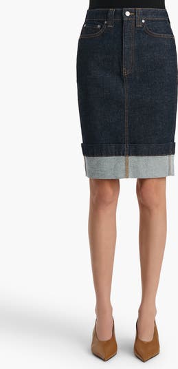 A permanently tacked hem reveals the lighter side of this low-stretch pencil skirt from Catherine Holstein's roster of coveted denim essentials—lauded by fashion insiders since the New York brand's debut. Each detail is carefully considered—from the marigold topstitching and antiqued silvertone button to the leather patch at the back.