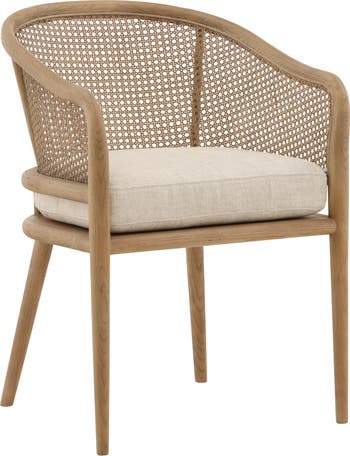The Kendrix Dining Chair blends natural materials with a relaxed, refined design. A solid ash wood frame in a light finish pairs with a woven cane back for an airy, open feel, while the linen seat adds softness and comfort. Its curved silhouette and layered textures create visual interest without overwhelming the space. Variations in wood grain and natural materials add to the character of each piece.