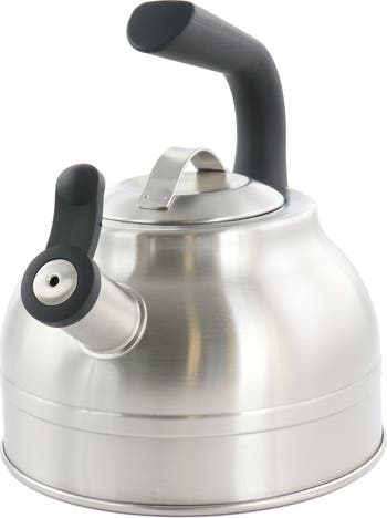 Enjoy a cozy warm beverage with this Kenmore Elite 2.3 Quart Stainless Steel Whistling Tea Kettle in Silver. The high quality stainless steel construction means optimal heat distribution and the satin finish resists rust, corrosion, and oxidation so you can use it for years to come. This kettle is super easy to use, no wires or batteries just simply fill up the kettle with water and place it on any cook top surface. Listen for the whistling noise to know your water has reached the boiling point and is ready to use!