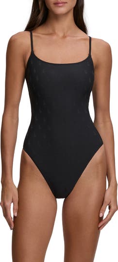 This stretchy one-piece swimsuit has a deeply dipped back that brings breezy flair to your sunny-day look.