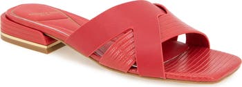 A square toe and low heel frame this warm weather-staple sandal topped with crisscross straps rich with texture.