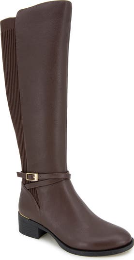 A stretchy knit back panel adds contemporary style and easy wear to a knee-high boot balanced by a plain toe and stacked block heel.