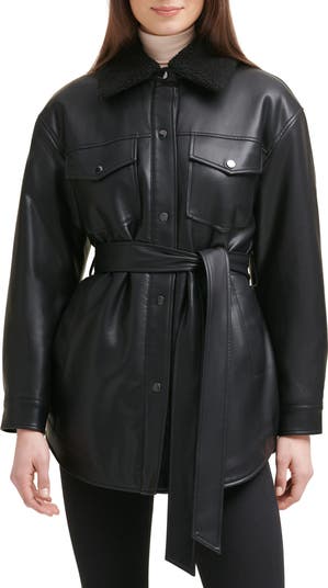 Belted Faux Leather Shirt Jacket with Faux Shearling Lining