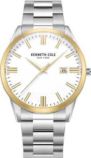 Two-tone markers pop against the clean white dial of a classic bracelet watch crafted from stainless steel with goldtone-plate trim.